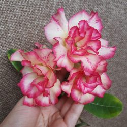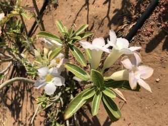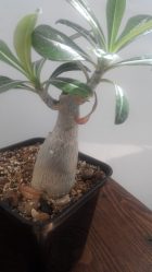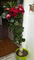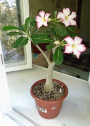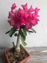 При выращивании адениума в домашних условиях, формируют бонсай, так как ствол у растения толстый, а само деревце не превышает 30 см. Красиво цветет белыми или малиновыми цветками. Цветение частое и обильное. Так как адениум похож на розу, в народе ему придумали название «Роза пустынь».
