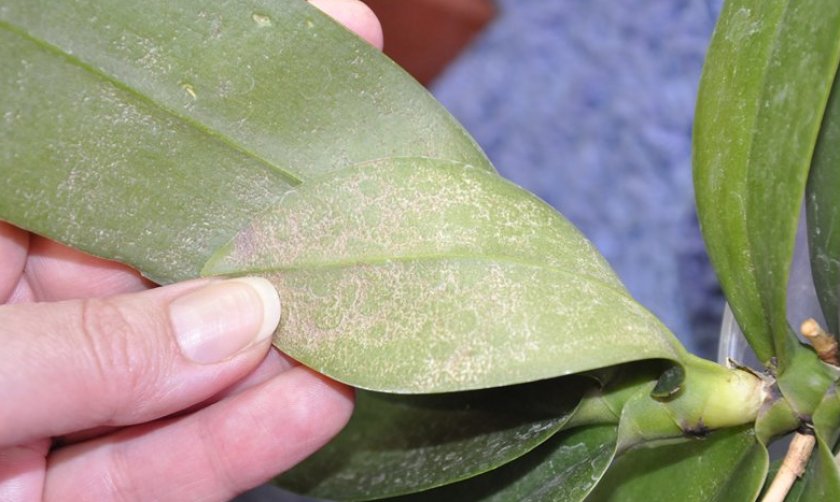 Нападение вредителей, высасывающих соки фаленопсиса. Сразу же после обнаружения вредителей на цветке необходимо с помощью секатора удалить заражённые листки, а затем вымыть оставшиеся листья и стебель орхидеи мыльной водой. Желательно применять хозяйственное или инсектицидное мыло. Если вышеуказанные методы не сработают, то следует использовать инсектицид, при этом наиболее заражённые части цветка всё же желательно срезать.