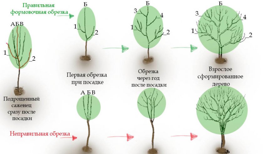 1. Первая обрезка проделывается по отношению еще к молодым саженцам, как только они достигли возраста 1 год. Отрежьте верхушку, это обеспечит рост нижних ветвей, таким образом крона будет формироваться, начиная с нижних побегов. 2. Следующий сезон предполагает точно такую же обрезку, только более верхнего яруса веток.