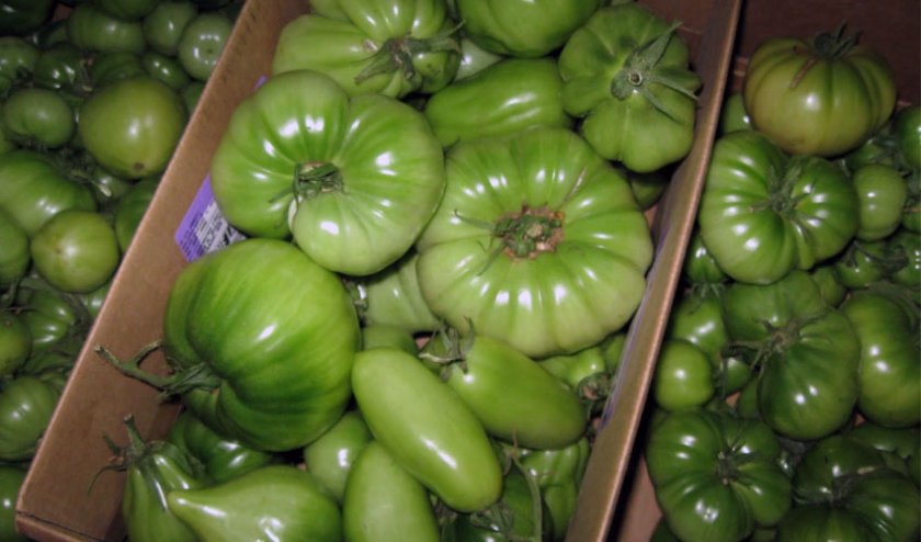 Собирают урожай в сухую погоду, желательно днём или вечером, поскольку по утрам зелень влажная от росы. Зелёные плоды должны соответствовать размеру спелых, недоразвитые экземпляры просто сгниют. Снимают помидоры среднепозднего и позднего созревания, в стадии молочной и бланжевой зрелости.