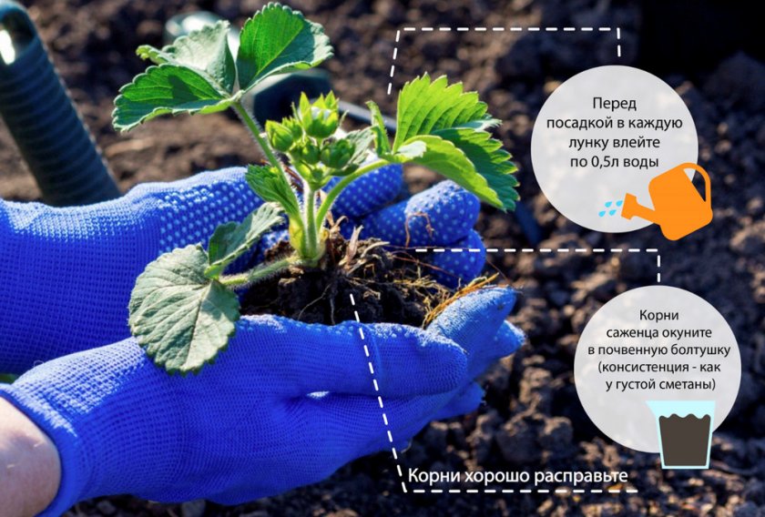 Ряды формируют на расстоянии 60 см друг от друга. Расстояние между лунками должно быть 25–40 см. Подготовленные ямки перед посадкой нужно полить. Расправить корни растения вертикально вниз.