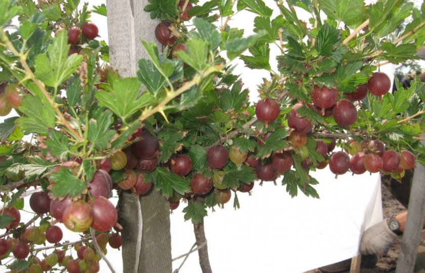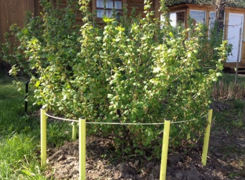 Подвязывают кусты чуть выше середины, при этом следует избегать чрезмерного сдавливания побегов, иначе это приведёт к деформации кроны крыжовника.