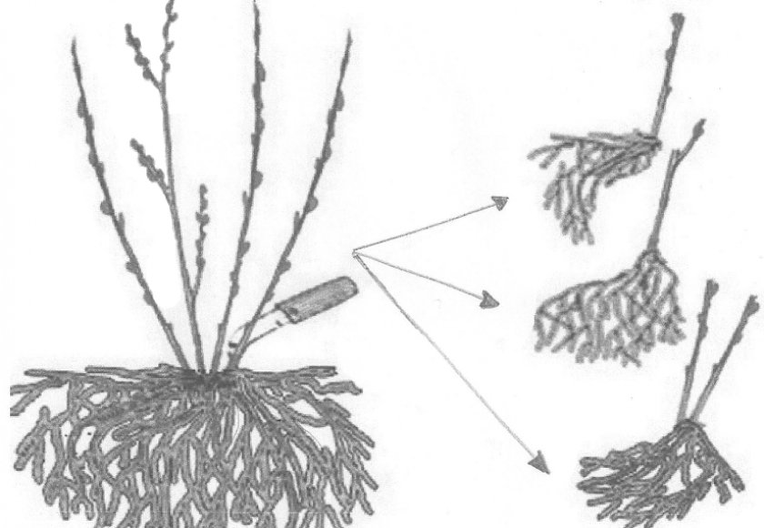 - делением куста — перед зимовкой нужно выкопать наиболее крупный куст и разделить его на 2-3 части. Каждую из делёнок в последующем следует посадить на новое место.