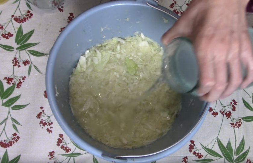 Хорошенько продавить руками, чтобы сырьё пустило сок. Сложить капусту в ведро, добавить воду.