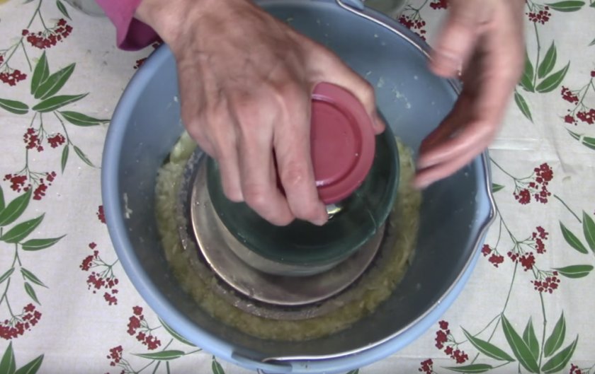 Уложить поверх сырья чистую тарелку, на неё установить банку объёмом 3 л, наполненную водой (как показано на фото ниже). Оставить настаиваться на 3–4 дня.