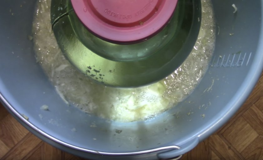 Пену нужно убирать при помощи половника на протяжении всего периода настаивания продукции. Кроме этого, чтобы обеспечить нормальное отхождение углекислого газа, следует сразу после сбора пены протыкать сырьё на всю высоту в нескольких местах. На 3–4 сутки, когда перестанет выделяться пена, продукцию нужно разложить в банки.