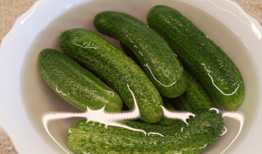 - Замочить в холодной воде минимум на 2 часа. Такая процедура необходима по двум причинам: во-первых, она позволяет избавиться от солей азотной кислоты (нитратов), которая могла накопиться в плодах из-за нарушения технологии их выращивания; во-вторых, замачивание обеспечивает сохранение плотной структуры зеленца. Чем больше времени прошло с момента сбора урожая до его заготовки, тем длительнее должно быть замачивание.
