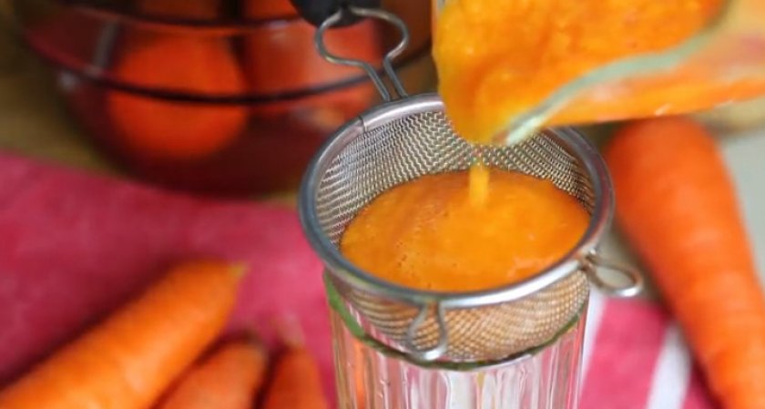 - Напиток процедить через самое мелкое сито. Или можно выжать из пюре сок с помощью марли, как это описано в следующем способе.