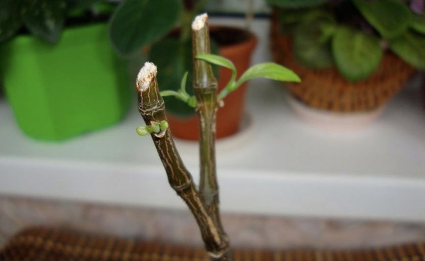 Уход за черенками предусматривает ежедневное проветривание и опрыскивание верхушек такой же тёплой водой. Если всё правильно сделать, то уже через 10–15 дней на конце отрезков появятся корешки. После этого их можно будет высадить в небольшие горшочки, наполненные почвой для взрослых растений.