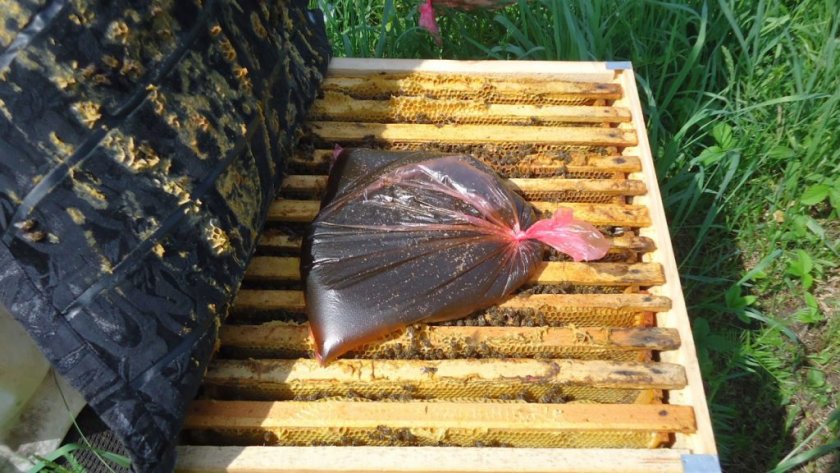 Для одноярусных корпусов на 12 рамок достаточно 5-6 л лечебной подкормки. Для многокорпусных ульев (2-3 корпуса) и лежаков уходит 10 л подкормки. Объём целебного сиропа (свыше 6 литров) скармливают пчёлам в 2-3 подхода, подливая жидкость по мере её употребления насекомыми.