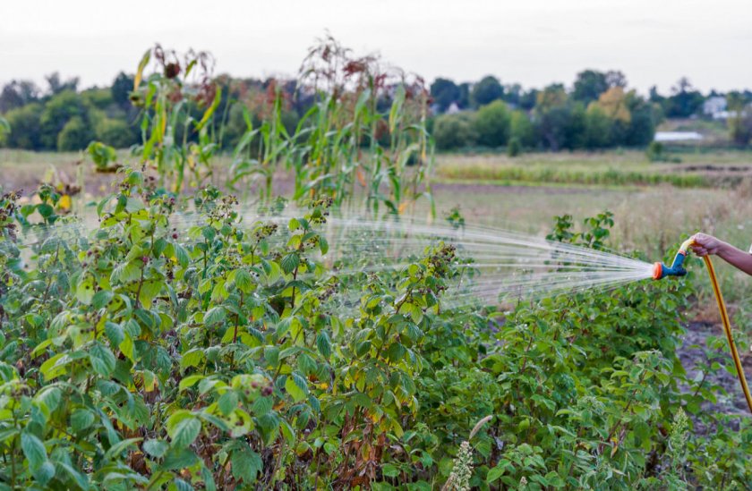 - Поливы. Малина любит расти в почве с умеренной влажностью, именно поэтому необходимо контролировать степень увлажнённости грунта, не допуская как его чрезмерного переувлажнения, так и подсыхания. При нормальных погодных условиях культуру поливают 3-4 раза в месяц. При засушливом лете количество оросительных мероприятий увеличивают до одного в неделю.
