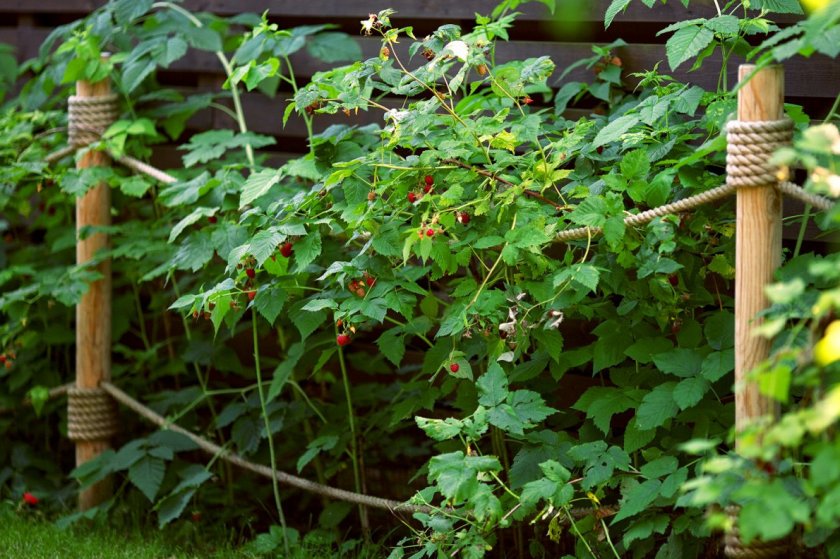 Данная конструкция состоит из нескольких вертикальных деревянных или металлических столбиков между которыми в горизонтальном направлении в несколько ярусов натянута стальная проволока. Побеги малины аккуратно расправляют в двух направлениях и подвязывают к проволоке посредством эластичного материала.